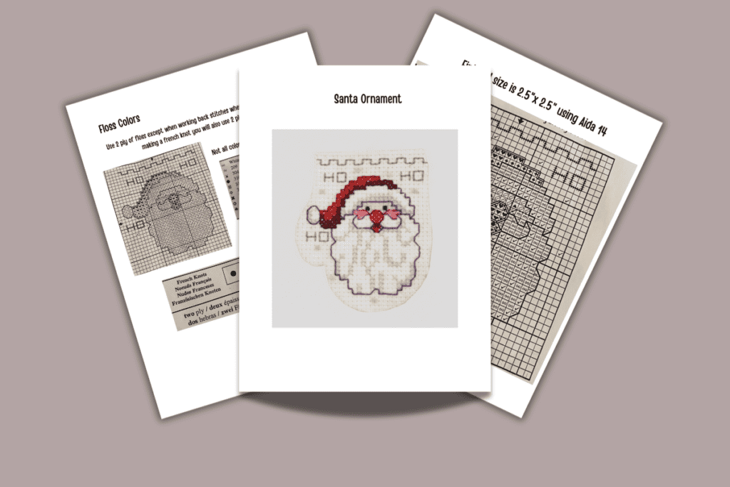 The PDF includes a chart to download and the floss color sheet. You will use 2 ply floss for your cross stitch Santa ornament unless doing a backstitch where you will use 1 ply.