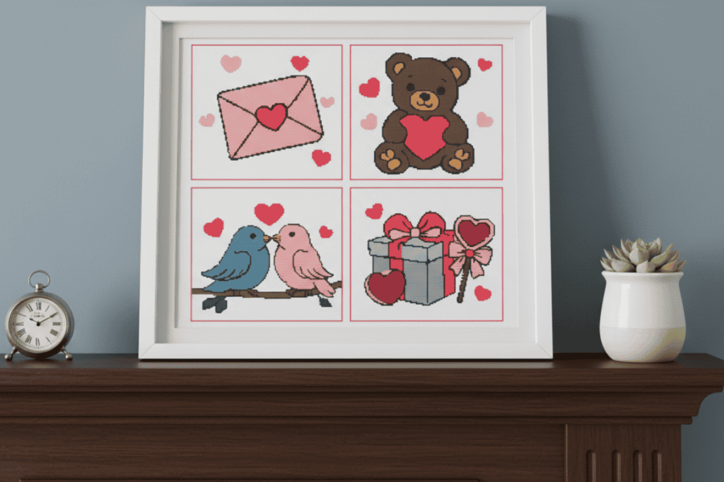 We have made this cross stitch pattern so simple. This cross stitch pattern uses less than 20 flosses so it’s perfect for a beginner. It’s such a cute way to decorate for Valentine’s Day.